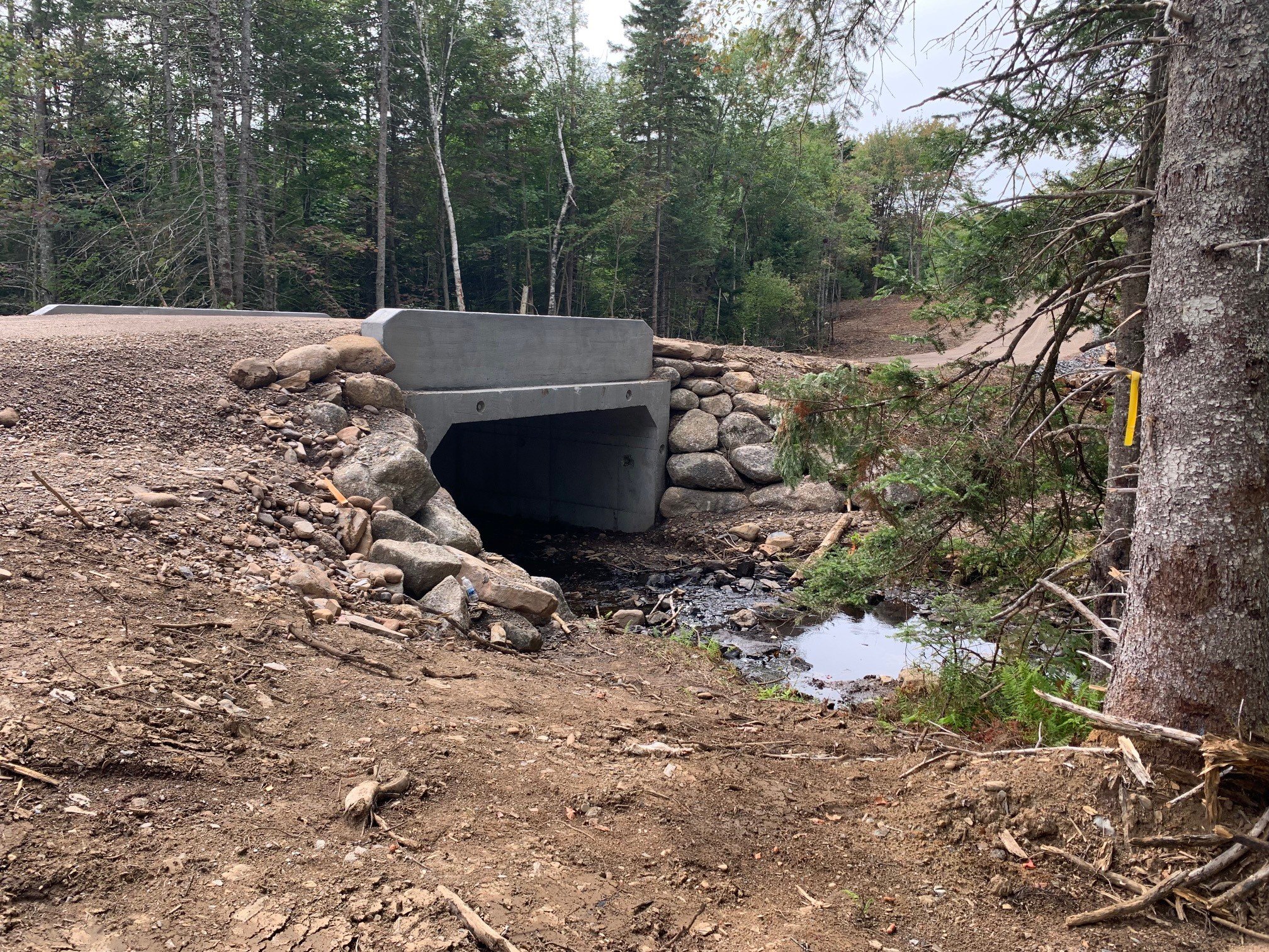 Our team was responsible for coordinating regulatory approvals, completing survey layout, advancing the roadway design, and executing full construction services, including tree clearing, installation of a precast box culvert watercourse crossing, cast-in-place concrete curb works, road subgrade preparation, aggregate placement, and ditch construction with rock lining for long-term drainage stability.